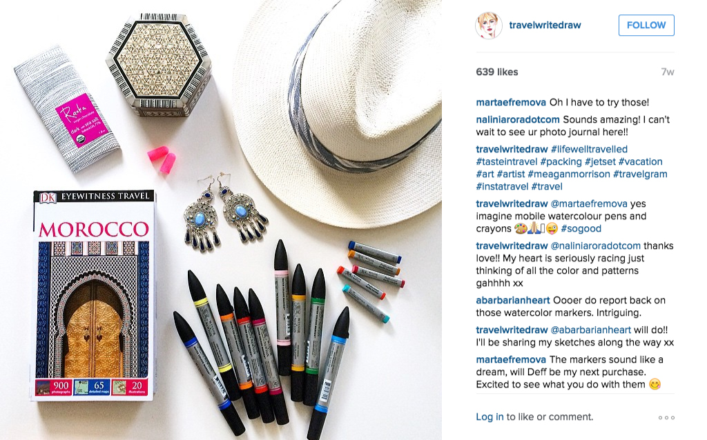 Once again prepping the #TravelWriteDraw #trip essentials only this time I’m leaving a little extra room for all my new @winsornewton_usa goodies!! I’ve been obsessed with using #WinsorNewton paints since my #highschool #fineart days and now I get to test drive their #watercolor #markers & sticks on this inspiring journey to #Morocco!! I can’t wait to create ?!! #NYC ✈️ #Casablanca ✈️ #Marrakech… A photo posted by Meagan Morrison (@travelwritedraw) on May 19, 2015 at 4:11pm PDT